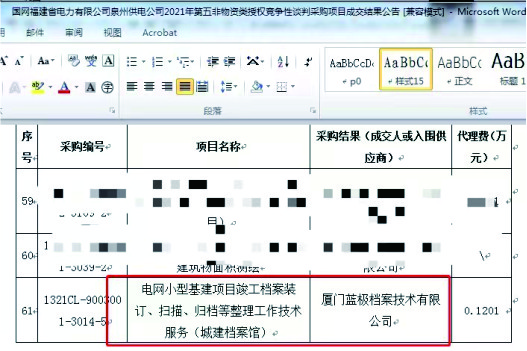 2021年6月10日公告,廈門藍極檔案有限公司參與并成功中標國網福建省電力有限公司泉州供電公司小型基建項目竣工檔案裝訂、掃描、歸檔等整理工作技術服務(城建檔案館)項目。